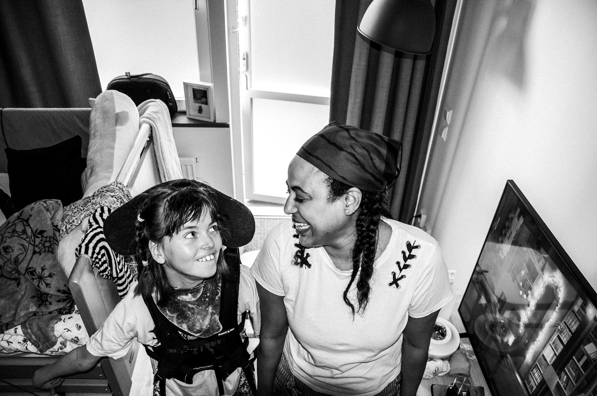 “I love you, my little sister,” Helen whispers at bedtime, as her hand gently strokes Selma’s forehead. Selma responds by letting her gaze rest lovingly in Helen’s eyes. Such an everyday scene would have been unthinkable thirty-three years ago. Before the Swedish Act Concerning Support and Service for Persons with Certain Functional Impairments – LSS – came into force, fourteen-year-old Selma would most likely have lived in an institution. Or not survived at all. Today she lives at home, surrounded by her family, and spends most of her free time with her beloved assistant Helen. Helen comes originally from Ethiopia. She lives in Sweden under asylum, having fled civil war, ethnic persecution, and threats of rape. Once, she was a small business owner, selling whisky to restaurants and hotels. Then everything changed. She first became a hotel cleaner in Luleå – and later Selma’s personal assistant in Stockholm. That their paths should have crossed is nothing short of a miracle. What are the chances? Who could have imagined it? Now they are like sisters, at times like mother and daughter – and always assistant and user. “Selma is like a dove. She flies close to God,” Helen often says. For Helen, Selma is a comfort in an otherwise comfortless world. For Selma, Helen is her voice, her arms, and her legs. They share more than the everyday. They both know what it is like not to be understood, to be constantly questioned – by people around them, by politics, by the authorities. Life is conditional, demanding proof of integrity again and again. At the same time, many of society’s doors remain closed. Yet in the margins, where few expect anything to grow, their unconditional love has taken root and flourished.